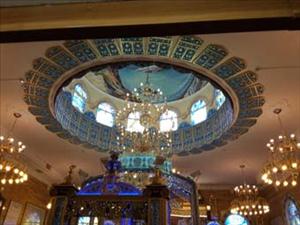 לאחר המעבר ברחבה נכנסים לבית הכנסת תוך מעבר בזוג דלתות עץ נוספות ,כאשר פנים בית הכנסת נבנה על פי דגמים של המסורת היהודית הקווקזית כולל הבמה וארון הקודש, שמעליו לוח עץ שעליו חרוט דגם של הכותל המערבי, משני צדדיו של ארון הקודש, שני עמודים המעוטרים בזהב ואבנים צבעוניות ואבני חן, מהתקרה משתלשלות נברשות מצופות זהב ,לאורך הקירות נפערו תשע שר חלונות עם זכוכיות וויטרז ,כאשר על שבע מהם מצוירים שבעת המינים , שנים עשר חלונות ממוקמים בכיפת אולם התפילה שבהם מופיע המוטיב של שני עשר השבטים.