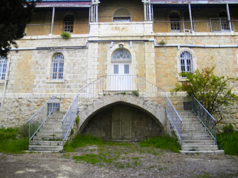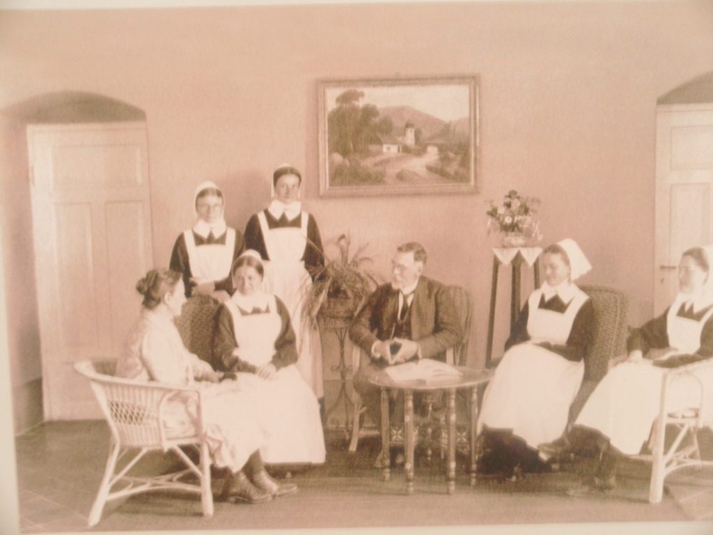 המבנה שנבנה בשנת 1867 בתכנונו של קונרד שיק, הברונים היו בני עדת האחים מהרנהוט , כת שנפרדה מהעדה הלותרנית בגרמניה שעיקרה היה מעבר לטיפול בחולים לגרום להם להתנצר בהצלת נפשותיהם למעשה החולים שהיו בני כל הדתות, ובתמורה לטיפול בבית החולים , החולים אולצו להשתתף בטקסים דתיים נוצריים במבנה הראשון שרתו אחיות ממסדר האחיות הדאקוניסות הגרמניות , בהמשך הועבר הטיפול בחולים במבנה למסדר האחים הבורומאיים – Herrenhutter Bomische Bruder.