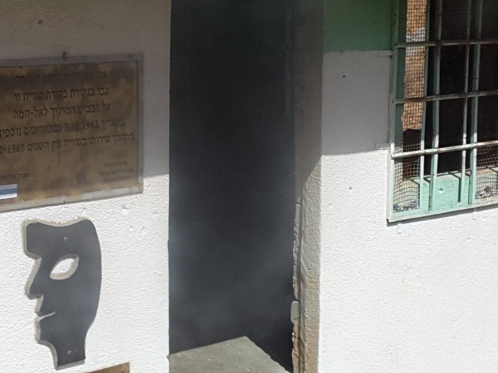 על הקיר מוטבע פסל ראש משיש חד ממדי המוצמד לקיר ועין גדולה המסמלת כי היא רואה הכול, מעליו טבלת נחושת שעליה כתוב את ספור רישיון המעבר שעליה חתום הגנרל הסורי ומתחת לתבליט הראש לוחית נחושת שניה שבה כתוב פסוק מהתנ"ך, במשקוף השמאלי עוד שני לוחיות נחושת של רישיונות המעבר אחת בסורית ואחת מתורגמת לעברית שנחתמו בידי מפקדו הסורי של הגולן.