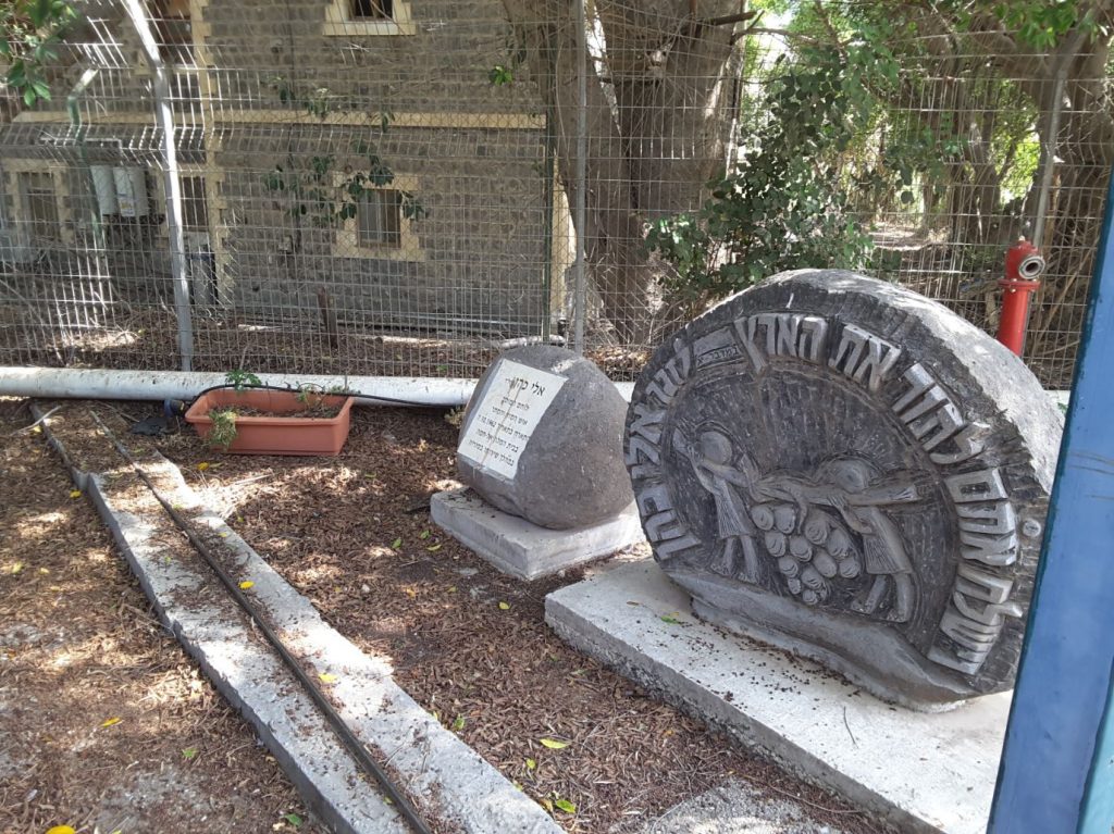 האנדרטה ממוקמת ליד שער גדר החניה החשמלי האחורי, וליד שרידי המבנה ששימש כבית מלון סורי , נבחין בסלע אפור שלידו אנדרטה חצי עגולה ,שעליה חקוקים ציור שני מרגליו של משה, הנושאים על כתפיהם מוט אשכול ענבים ,שנשלחו לתור את הארץ לידו עמוד מידע קולי.