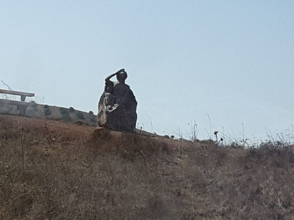 ממשיכים לנסוע צפונה לכוון הישוב מרום הגולן ,ליד שלט ההכוונה לקבוץ פונים שמאלה עד שנתקלים בפסל אבן של אישה החובקת שלושה ילדים ופניה לכוון דמשק ,פסל המדמה את רעייתו נדיה של אלי ושלושת ילדיה הממתינים לשובו.