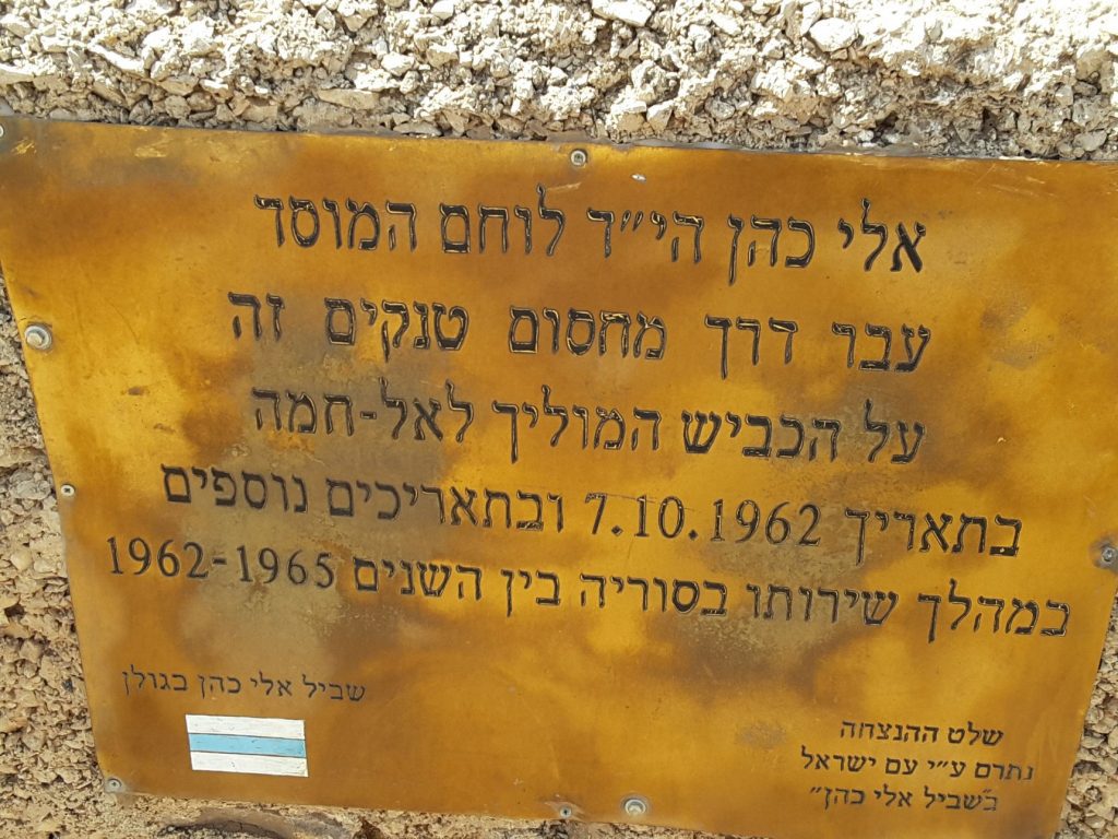בסיורו הראשון של אלי כהן ,הוא התלווה לקרוב משפחה של הרמטכ"ל הסורי באותה העת, שהיה ממונה על מנהל הדלק הצבאי , נוסעים על הכביש הדרומי המוביל מצומת צמח המקיף את הכנרת ונרד למגרש החנייה של חמת גדר, במגרש החניה הגדול ממשיכים שמאלה לכביש קטן המוביל לשער אחורי .